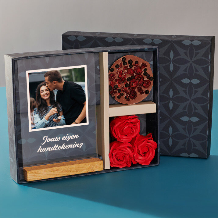 1. Acrylglasafdruk – een unieke, gepersonaliseerde herinnering die emoties en waardevolle momenten tot leven brengt. 2. Melkchocolade medaille met kersen en bosbessen – voor een verfijnde smaaksensatie. 3. Zeeprozen – maken het relaxmoment nog sfeervoller. 4. Stijlvolle donkerblauwe geschenkdoos – verhoogt de beleving bij het uitpakken. Deze cadeauset is zonder twijfel een onvergetelijk geschenk voor een dierbare en laat zien hoeveel die persoon voor je betekent. Een verrassing die gegarandeerd een glimlach op iemands gezicht tovert. Extra informatie:De set bevat een standaard voor de acrylglasafdruk.