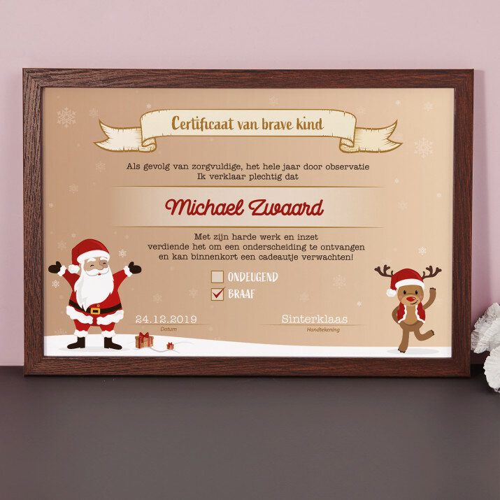Het certificaat is gedrukt op fotopapier van 20x30cm en is ingelijst in een elegante lijst van 20x30cm.