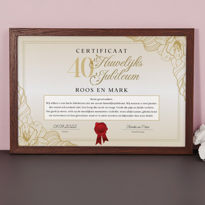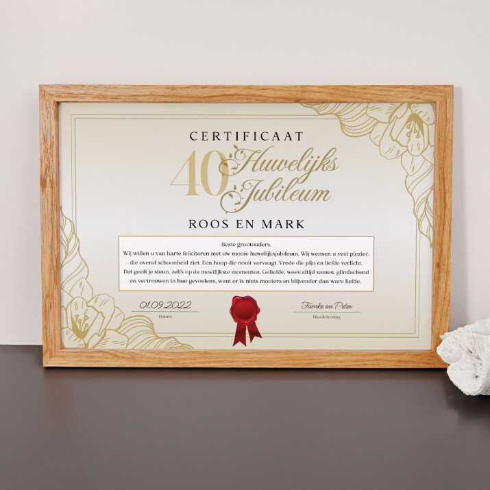 Een certificaat ter gelegenheid van de huwelijksverjaardag van uw grootouders is een ontroerend geschenk. Zorgvuldige afwerking en elegant design benadrukken het unieke karakter van dit jubileum.