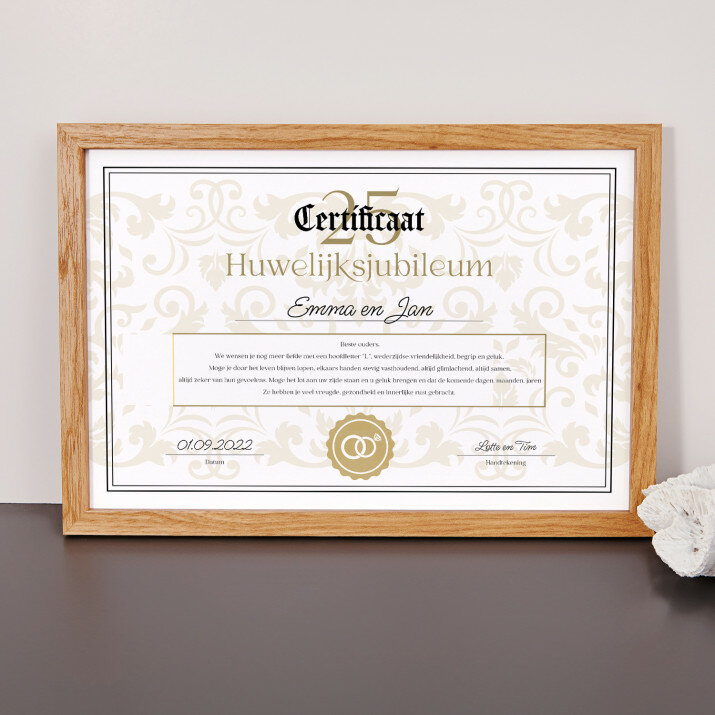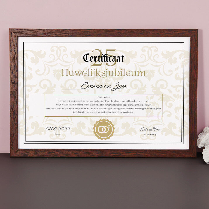 Als cadeau voor de huwelijksverjaardag van je ouders is dit certificaat onvervangbaar. Het is een unieke manier om hun liefde en de duurzaamheid van hun huwelijk te vieren.