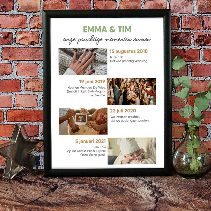 Een prachtige compositie van jouw foto’s, gecombineerd met een paar woorden recht uit het hart en persoonlijke onderschriften. Het perfecte cadeau voor iemand met wie je veel herinneringen deelt. Kies jullie favoriete foto’s van de mooiste momenten samen, en wij maken er een blijvende herinnering van. Daarnaast is het ook een originele en sfeervolle decoratie voor in huis.UITVOERING