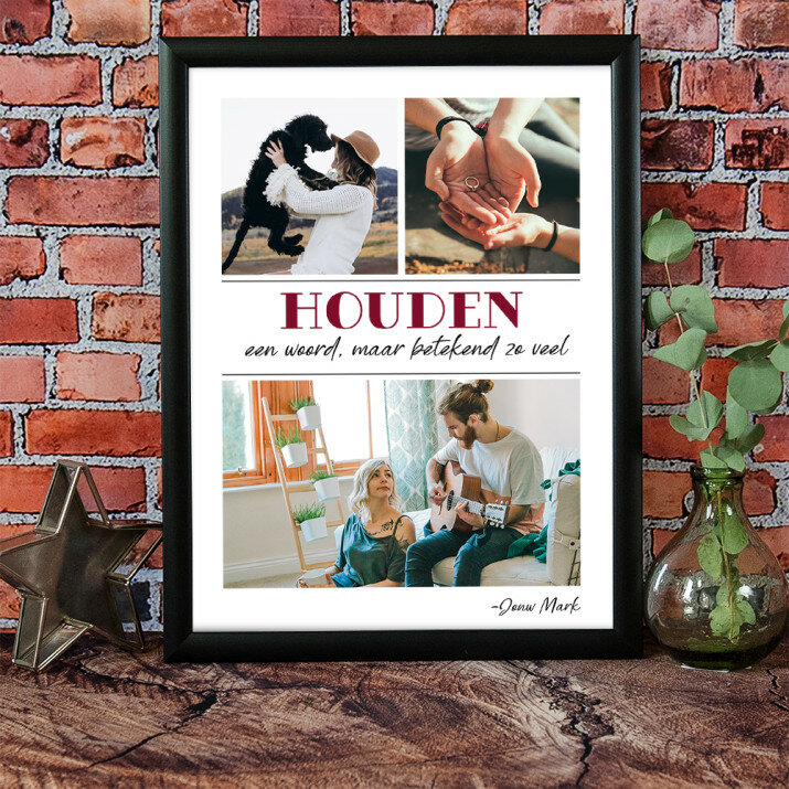 Een prachtige compositie van jouw foto’s, gecombineerd met een paar woorden recht uit het hart en persoonlijke onderschriften. Het perfecte cadeau voor iemand met wie je veel herinneringen deelt. Kies jullie favoriete foto’s van de mooiste momenten samen, en wij maken er een blijvende herinnering van. Daarnaast is het ook een originele en sfeervolle decoratie voor in huis.UITVOERING