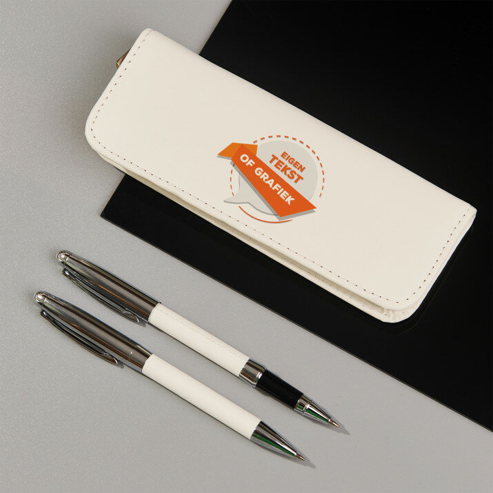 Elegancki zestaw piśmienniczy w skórzanym, białym etui składa się z długopisu i pióra kulkowego z wkładami w kolorze niebieskim! Zestaw idealnie sprawdzi się jako prezent na różne okazje - Dzień Nauczyciela, zakończenie roku szkolnego lub urodziny. Personalizowany wzór umieszczony na powierzchni produktu sprawi, że prezent stanie się jeszcze bardziej wyjątkowy. Każdy, kto ceni klasyczny styl i solidne wykonanie, na pewno ucieszy się z takiego upominku! Piórnik zamykany jest na zamek błyskawiczny.Kolor: biały