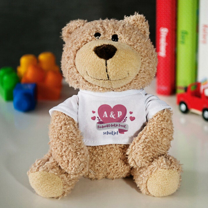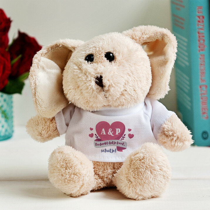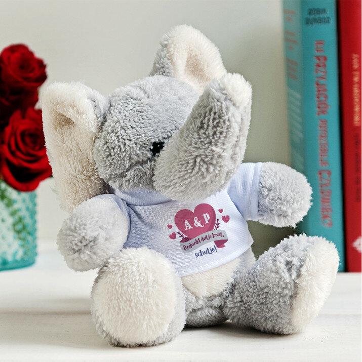 In t-shirtjes met jouw opdruk geklede zachte en aangename knuffels zijn gemaakt van pluche. T-shirt van polyester. De opdruk is duurzaam en full-color, waardoor de kleuren levendig en helder zijn! Beschikbare soorten knuffels:- Olifantje - hoogte 16 cm
