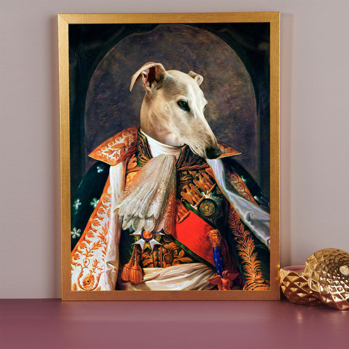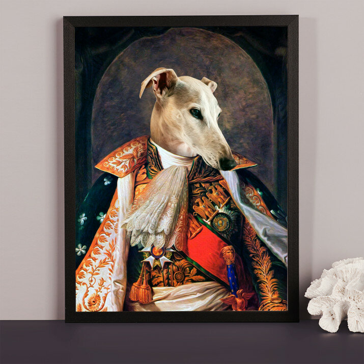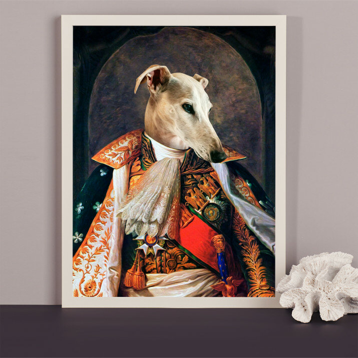 Dit koninklijke portret van mijn huisdier is een waar kunstwerk. Het ziet er prachtig uit aan de muur en weerspiegelt het karakter van mijn huisdier.