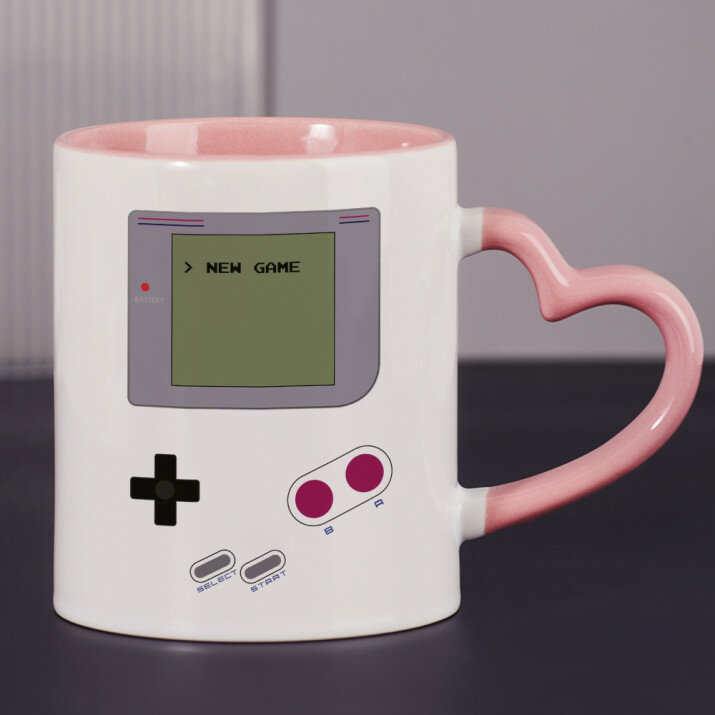 Er zijn ook mokken met een hartvormig handvat en een roze binnenkant, met een inhoud van 330 ml