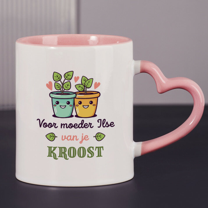 Er zijn ook mokken met een hartvormig handvat en een roze binnenkant, met een inhoud van 330 ml