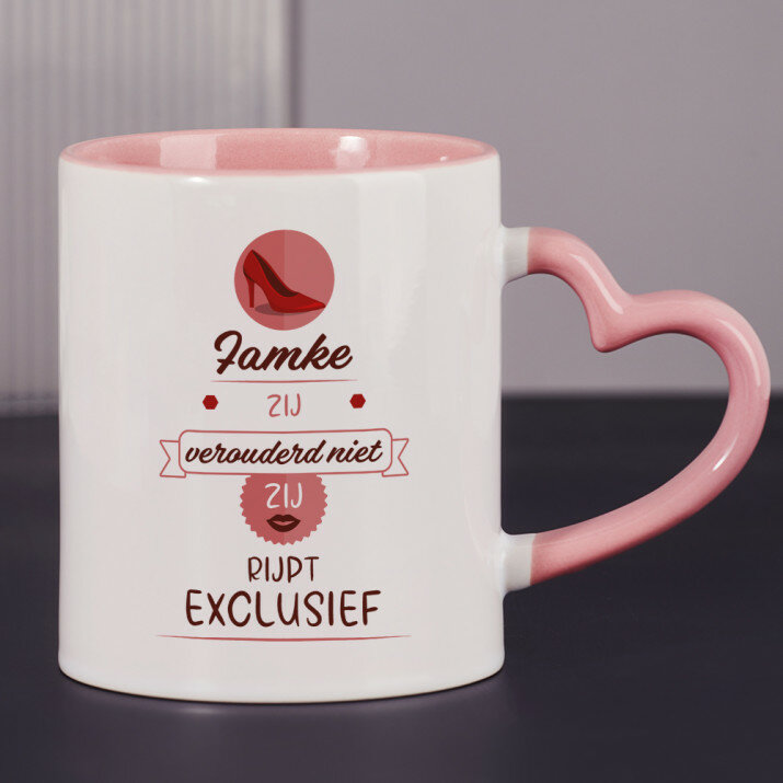 Er zijn ook mokken met een hartvormig handvat en een roze binnenkant, met een inhoud van 330 ml