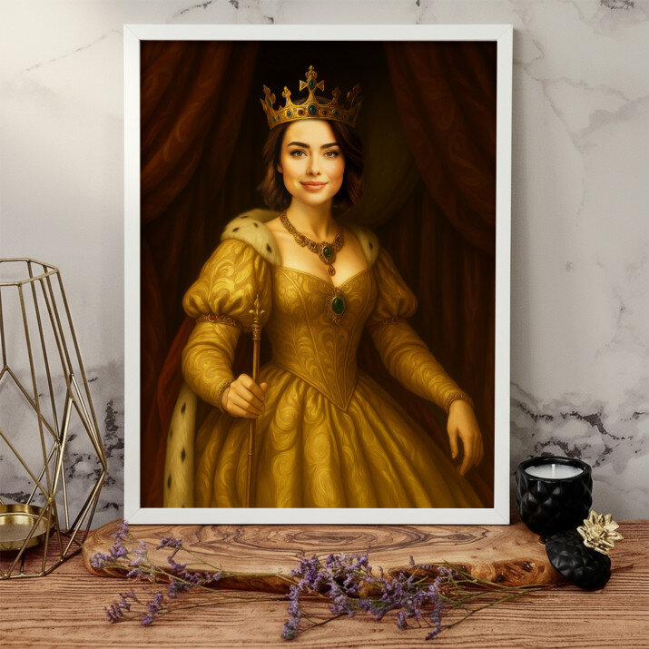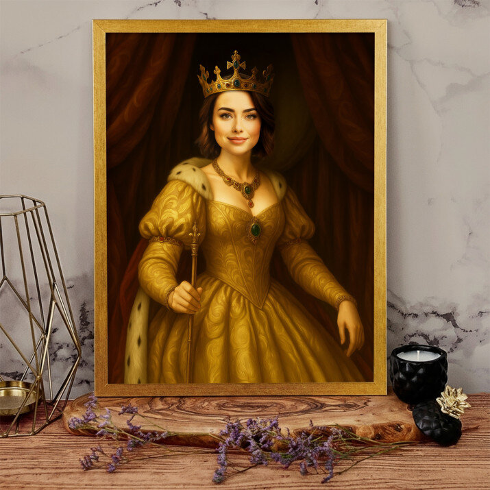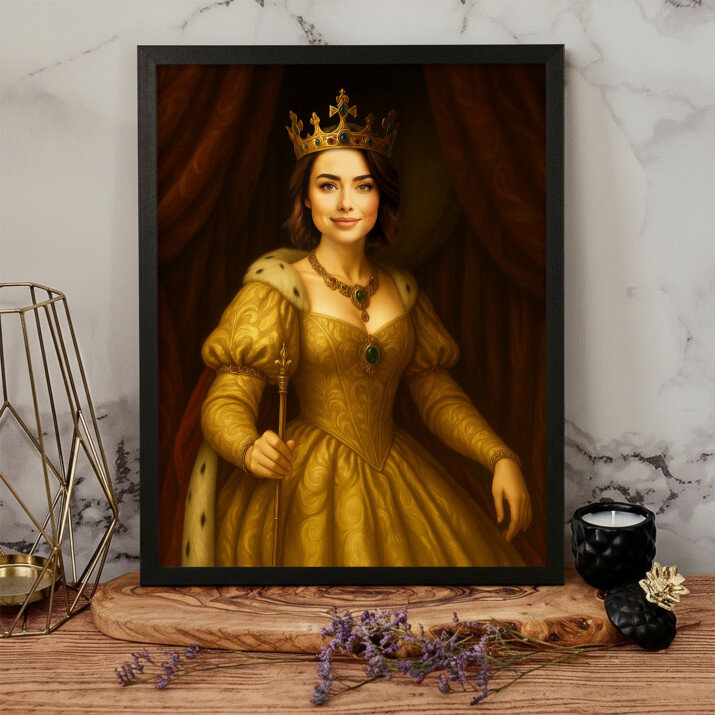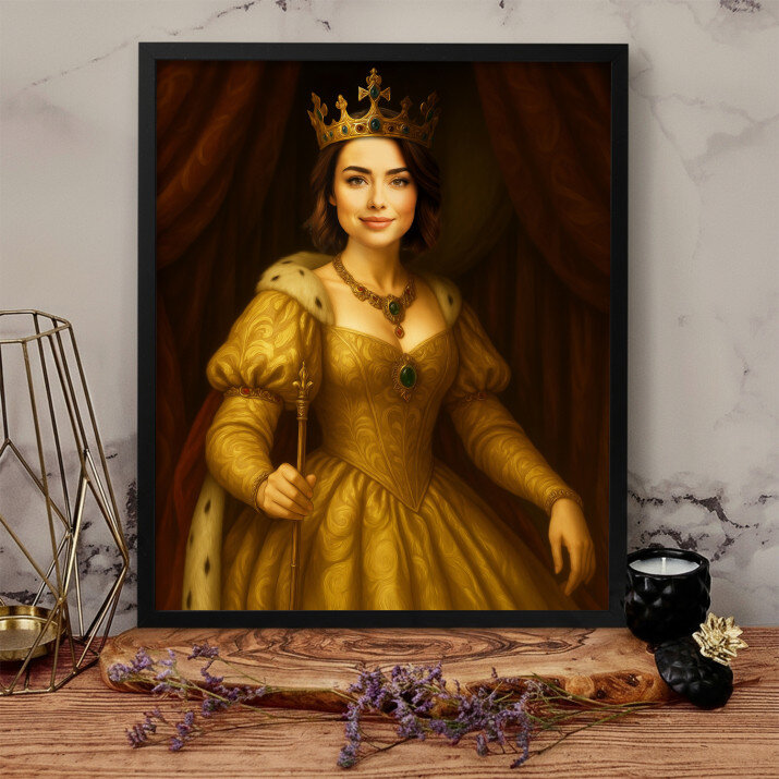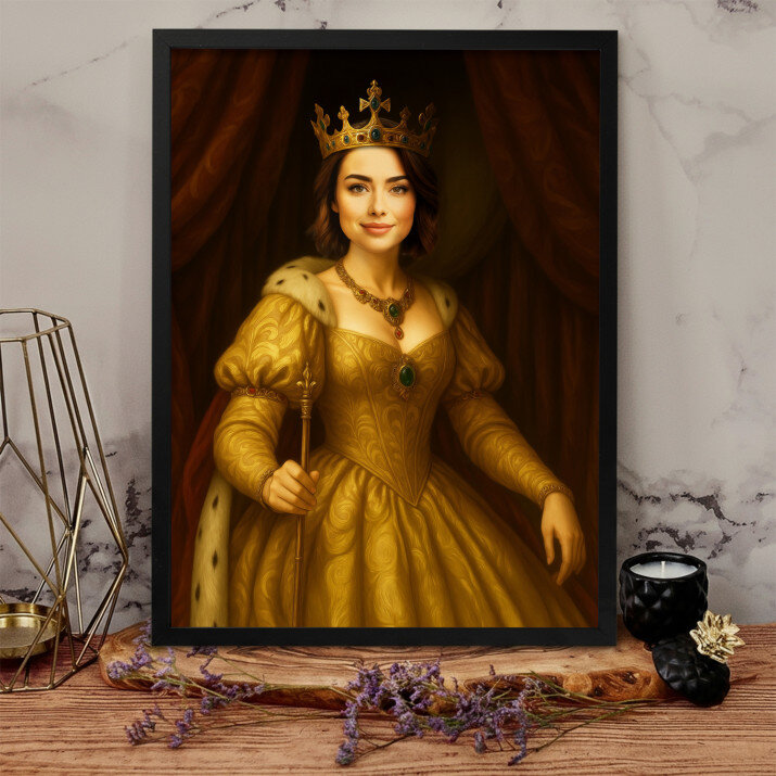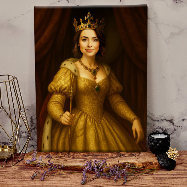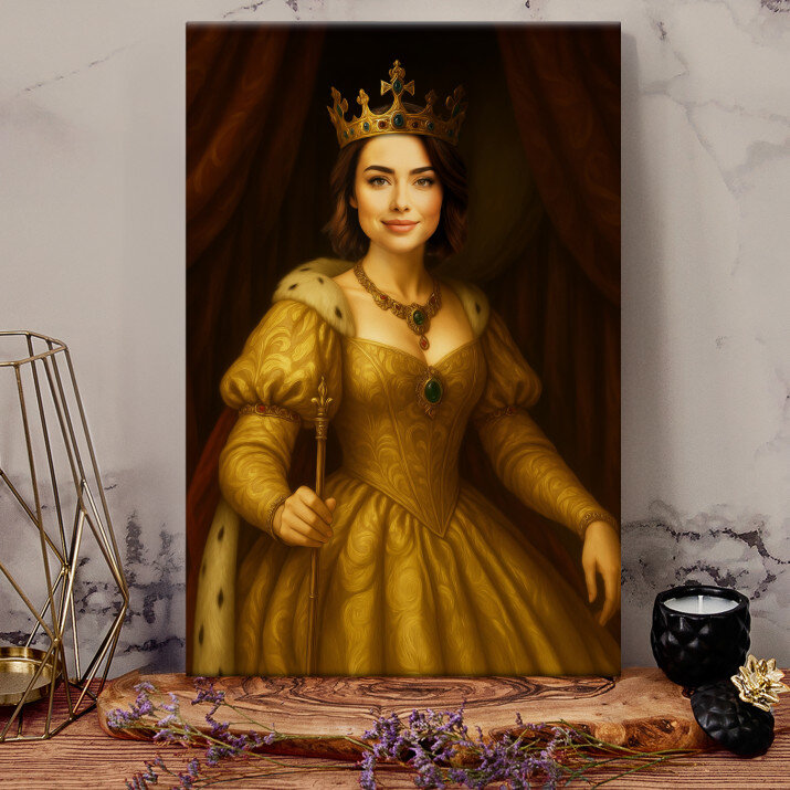 Dit is een perfecte manier om de stijl van het interieur te benadrukken. Een koninklijk portret op canvas is een prachtige decoratie die de aandacht trekt.