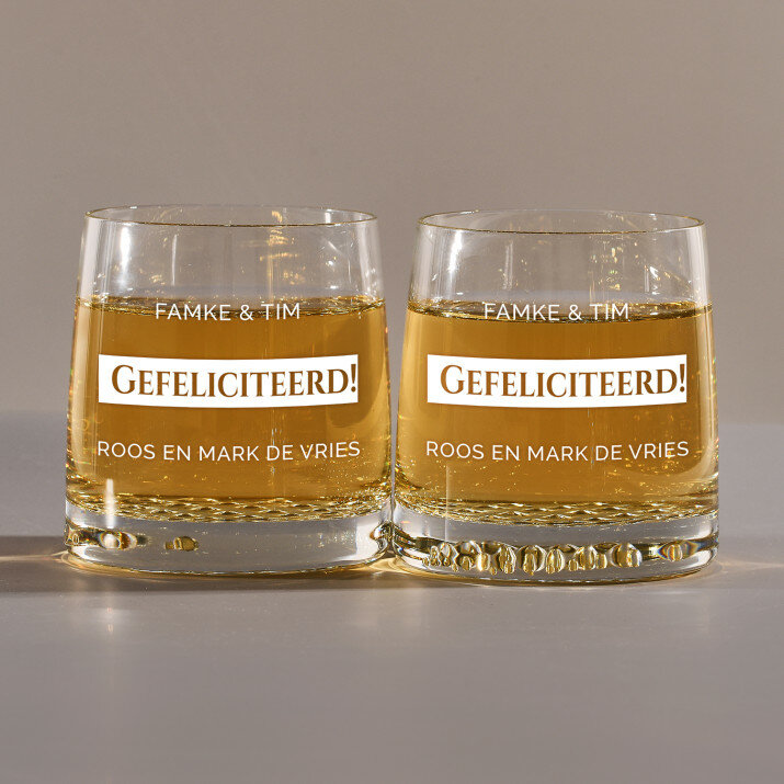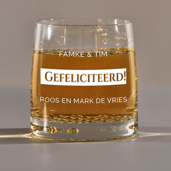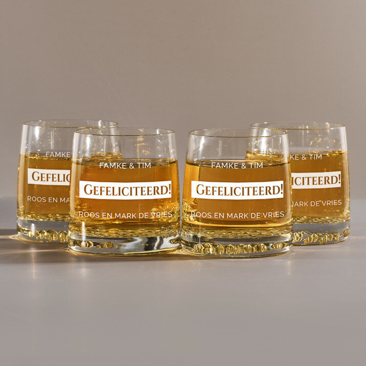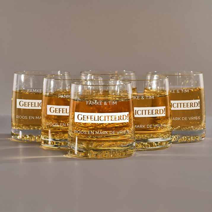 Het personaliseren van whiskyyglazen is heel eenvoudig – vul de verplichte velden in met jouw eigen idee, klik op de knop "toevoegen aan winkelwagen" en plaats je bestelling, die binnen enkele dagen bij je thuis zal zijn!
