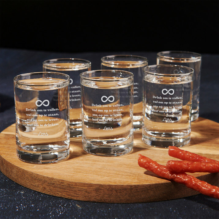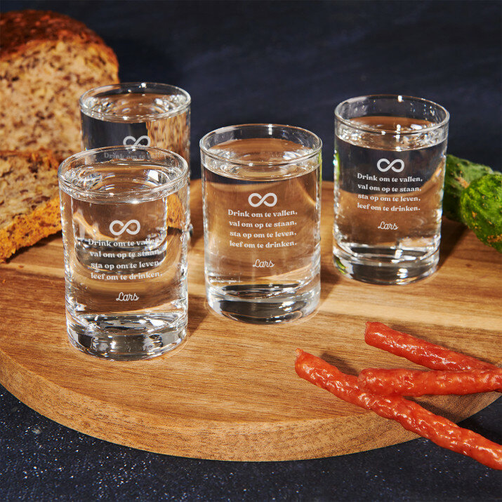 Elegante schotglaasjes van hoogwaardig, helder glas. Eenvoudige, klassieke vorm en perfect uitgebalanceerde verhoudingen maken deze glaasjes geliefd bij iedereen en ideaal voor allerlei soorten feesten. Op het gladde oppervlak van het product plaatsen we een gepersonaliseerde gravure, waardoor het uitbrengen van een toost nog plezieriger wordt! De glaasjes zijn verkrijgbaar individueel of in sets van 2, 4 of 6 stuks. Geschikt voor de vaatwasser.