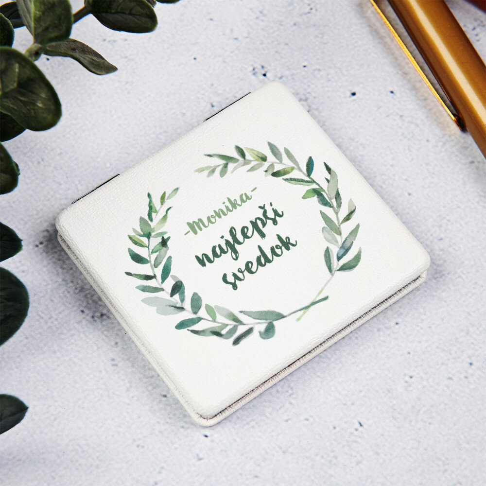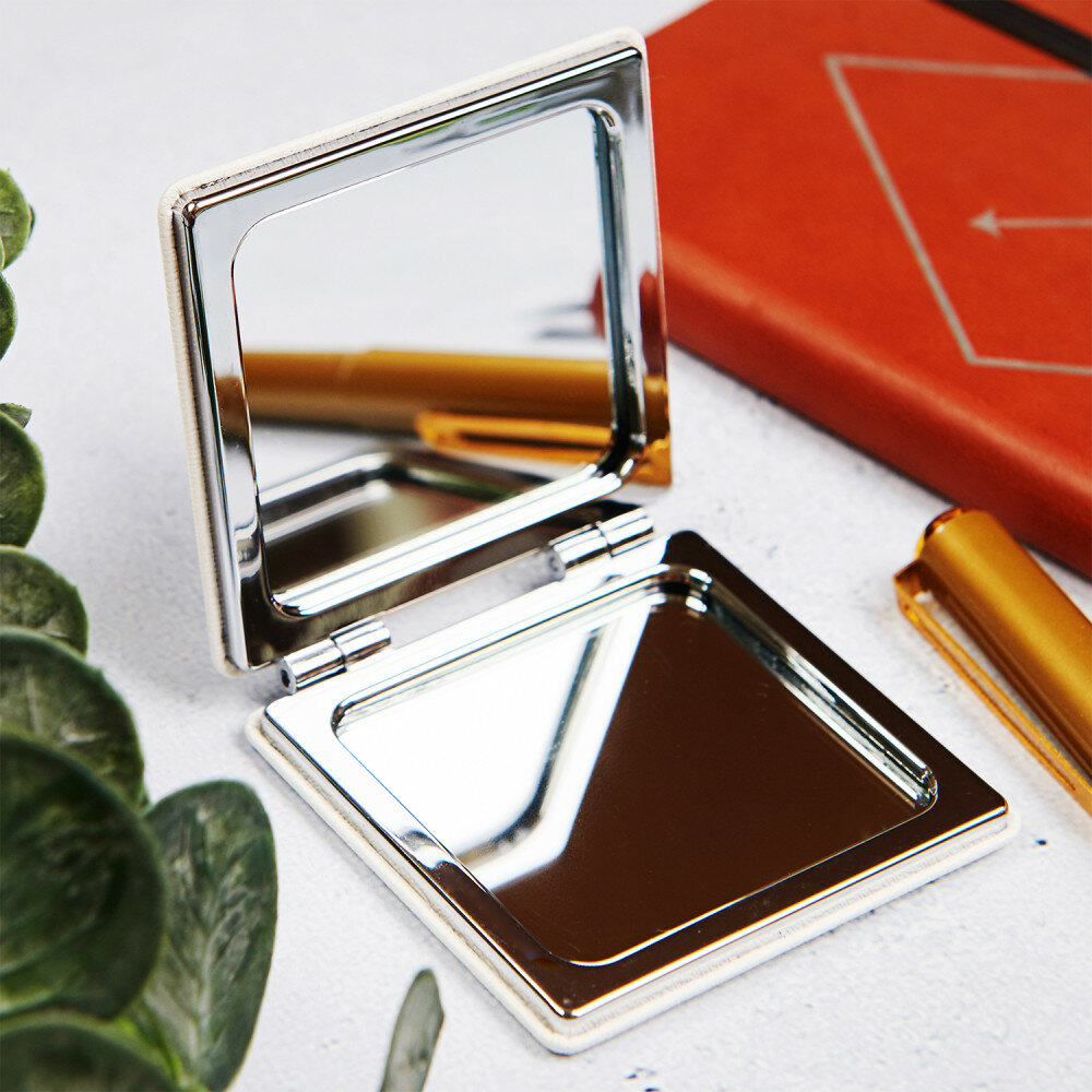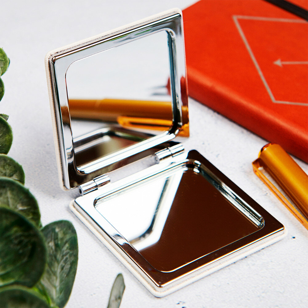 Zakformaat, onverbrekelijke spiegel gemaakt van gepolijst metaal, bedekt met eco-leer in wit. De spiegel heeft zowel een standaard als een vergrootglas, wat gebruiksgemak in elke situatie garandeert. Het elegante, tijdloze design spreekt iedereen aan. Een onmisbaar item in elke dameshandtas.