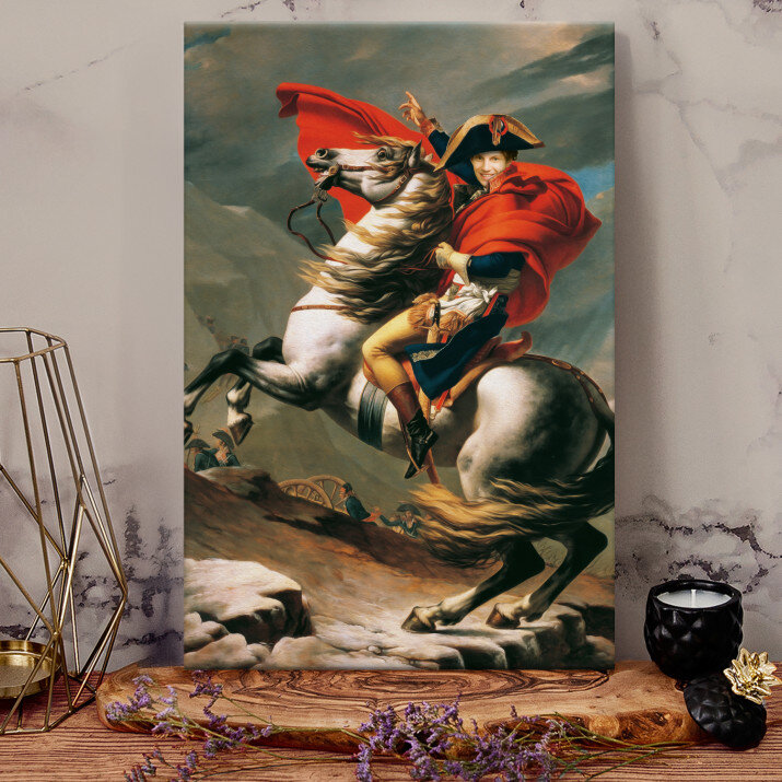 Dit schilderij op doek met een portret van Napoleon te paard is een waar kunstwerk. De unieke details en helderheid van kleuren zijn indrukwekkend.